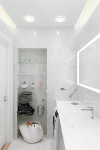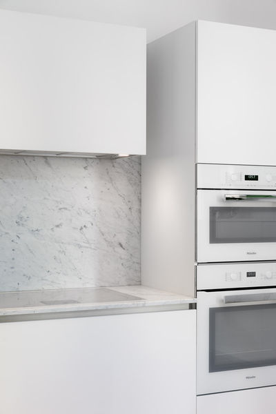 Alun perin sokkeloista pohjaa avarrettiin ja muokattiin sopimaan kahden hengen kodiksi. Toteutimme kohteessa purkutyöt, talotekniikan uusimisen, kaikki rakennustekniset työt sekä huolelliset viimeistelytyöt. Työn aikana kylpyhuone laajennettiin kokonaisuudeksi, keittiö siirrettiin toiselle puolelle huoneistoa ja rakennettiin uusi WC-tila. Lisäksi kaikki huoneiston ovet entisöitiin ja muokattiin sopimaan uuteen huonejärjestykseen. Huoneistossa käytetään paljon epäsuoraa valaistusta, mikä nosti viimeistelytöiden laatuvaatimuksen korkealle. Oman mielenkiintoisen lisän projektiin toivat huoneistoon rakennetut pylväät, jonka muodot jäljennettiin rappukäytävän koristeista.